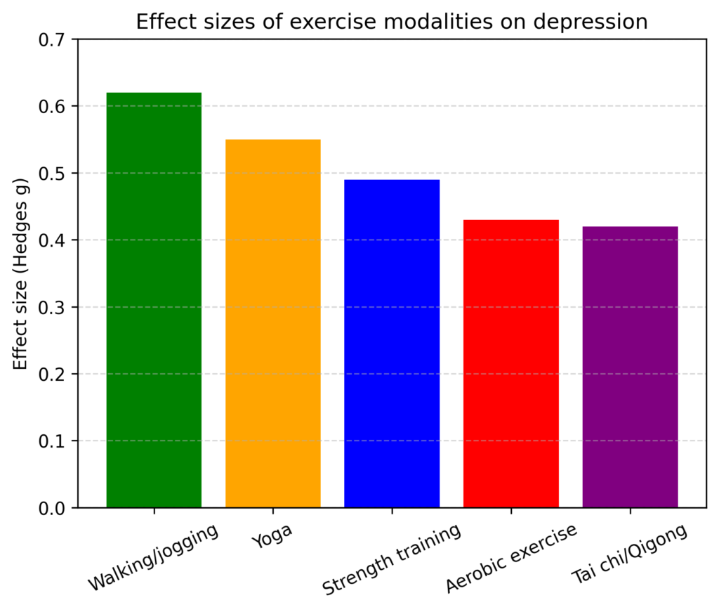 2019年までの218件のランダム化比較試験を網羅したネットワーク・メタ解析によると、運動療法は抑うつ症状の改善に有効であることが示されました。ウォーキングやジョギング、ヨガ、筋力トレーニング、エアロビクスなど様々な運動が対象となり、以下のような効果量(Hedges g)が報告されています。