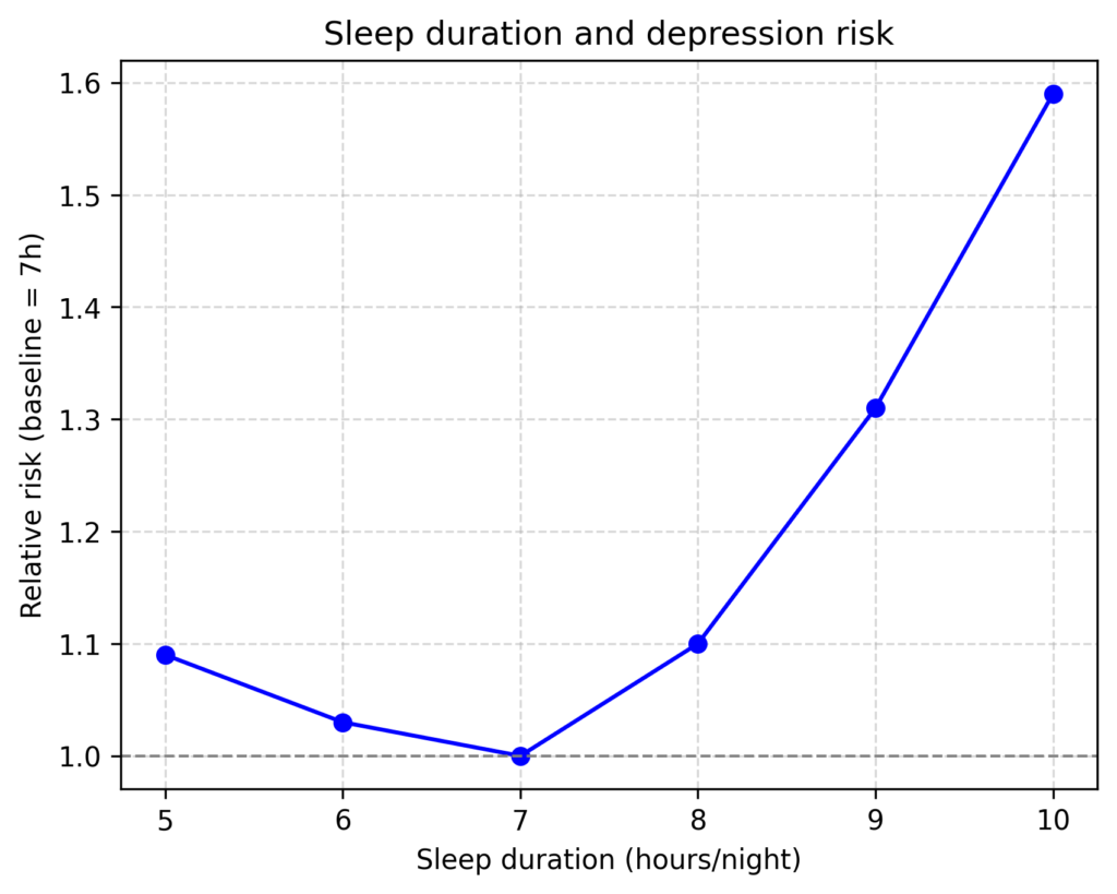 2. Li X., et al. “Relationship between night‑sleep duration and risk for depression among middle‑aged and older people: A dose–response meta‑analysis.” Front Physiol. 2023;14:1085091. 7時間睡眠を基準に、短すぎる睡眠(5〜6時間)と長すぎる睡眠(8〜10時間)が抑うつリスクを上昇させるU字型の関係を示した。