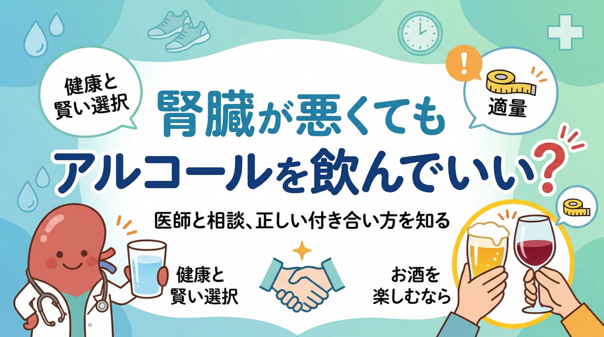 - 既に腎疾患がある場合は控える:腎臓の機能が低下している人は脱水や血圧上昇により症状が悪化しやすいため、主治医と相談しながら禁酒または厳格な節酒を検討しましょう。